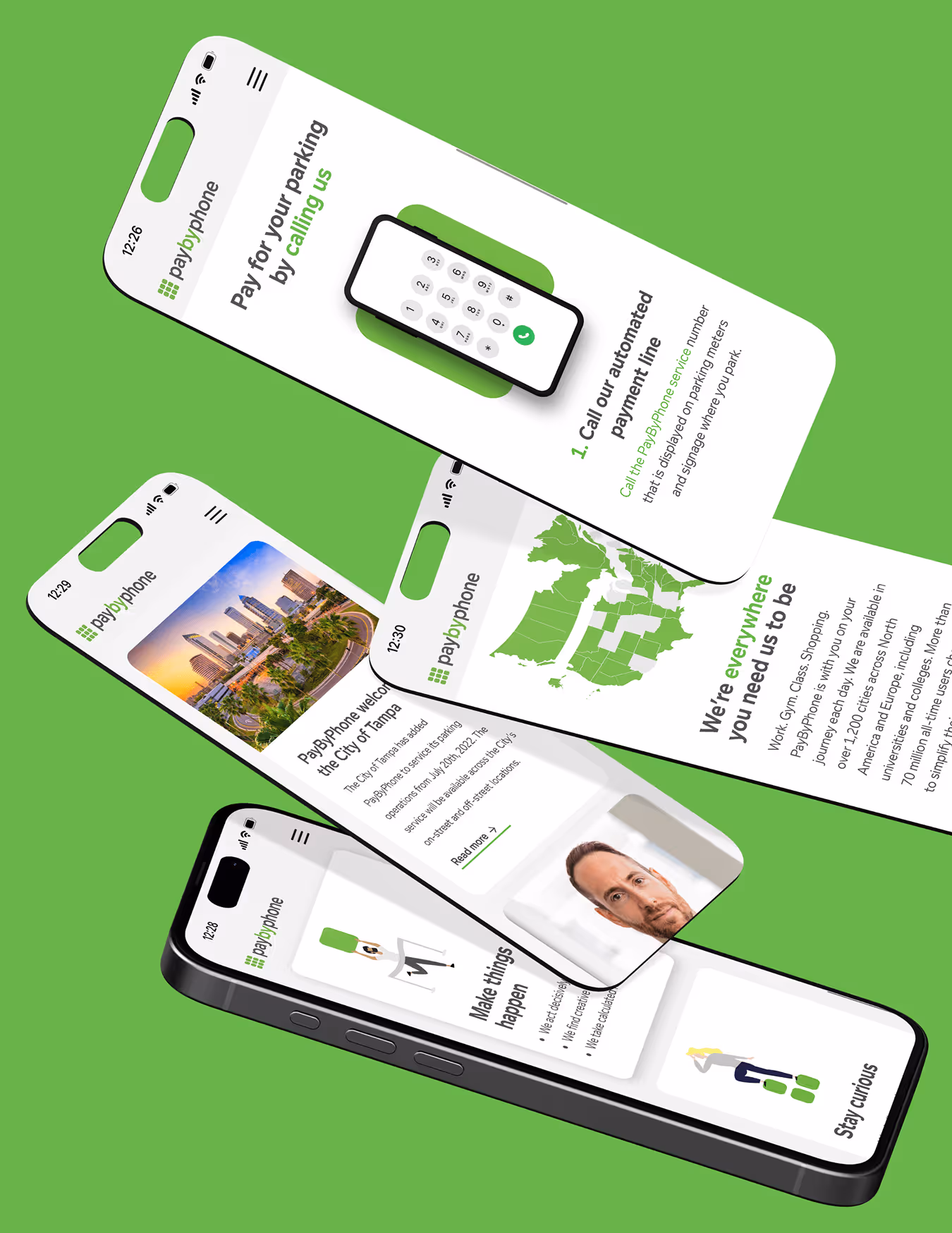 We gingen samen ‘the extra mile’ voor een vernieuwde visuele identiteit die het wereldmerk PayByPhone bewaakt en de verschillende markten samenbrengt. Door te werken aan een robuuste ‘master website template’, kunnen de lokale teams nu eenvoudig hun eigen siteversies ontwikkelen, terwijl de merkbeleving gelijklopend blijft. Dit collaboratieve proces heeft geleid tot een uniforme en sterke merkcommunicatie, waarin iedere stem werd gehoord en de kern van het merk behouden blijft, van cultuur tot cultuur.