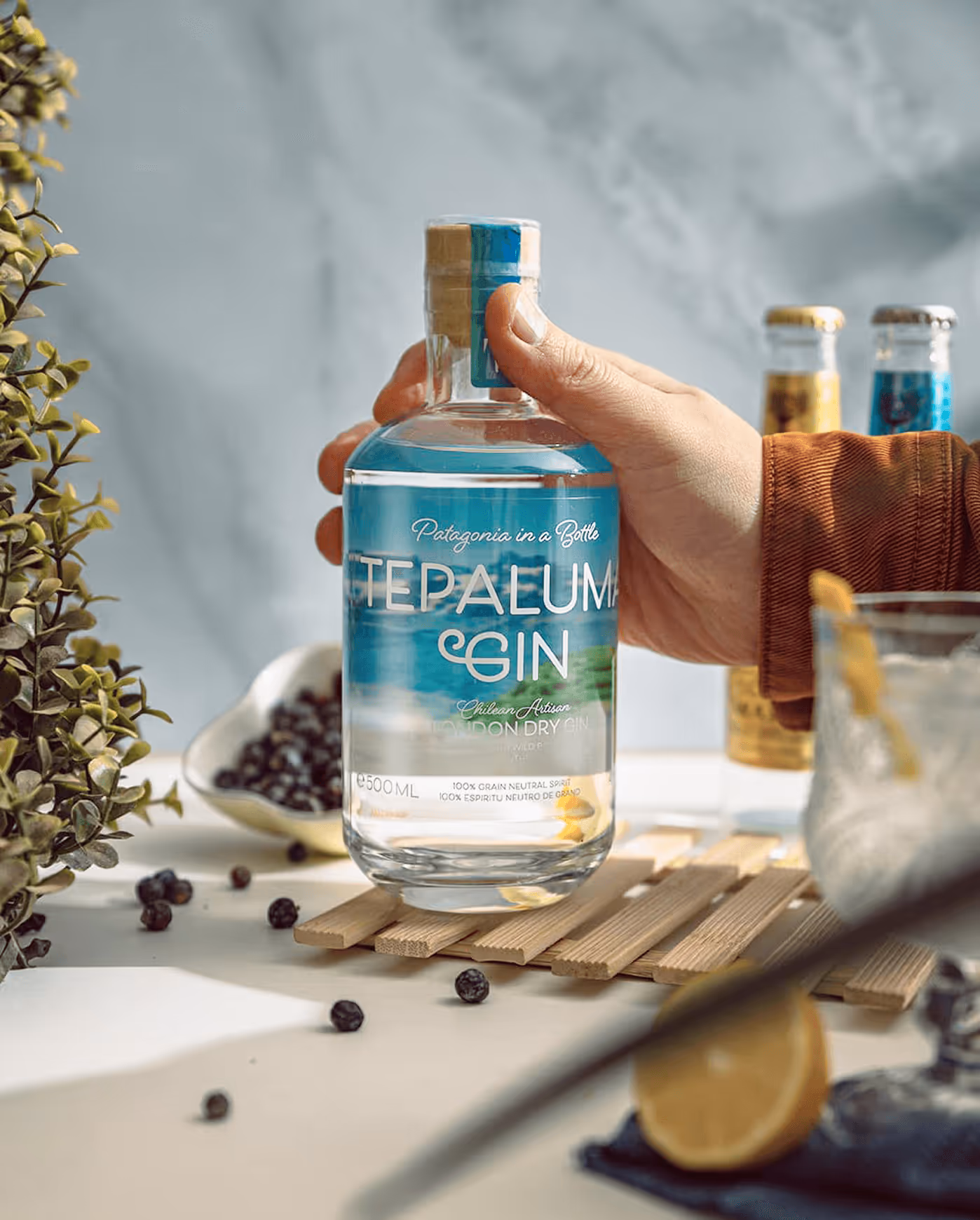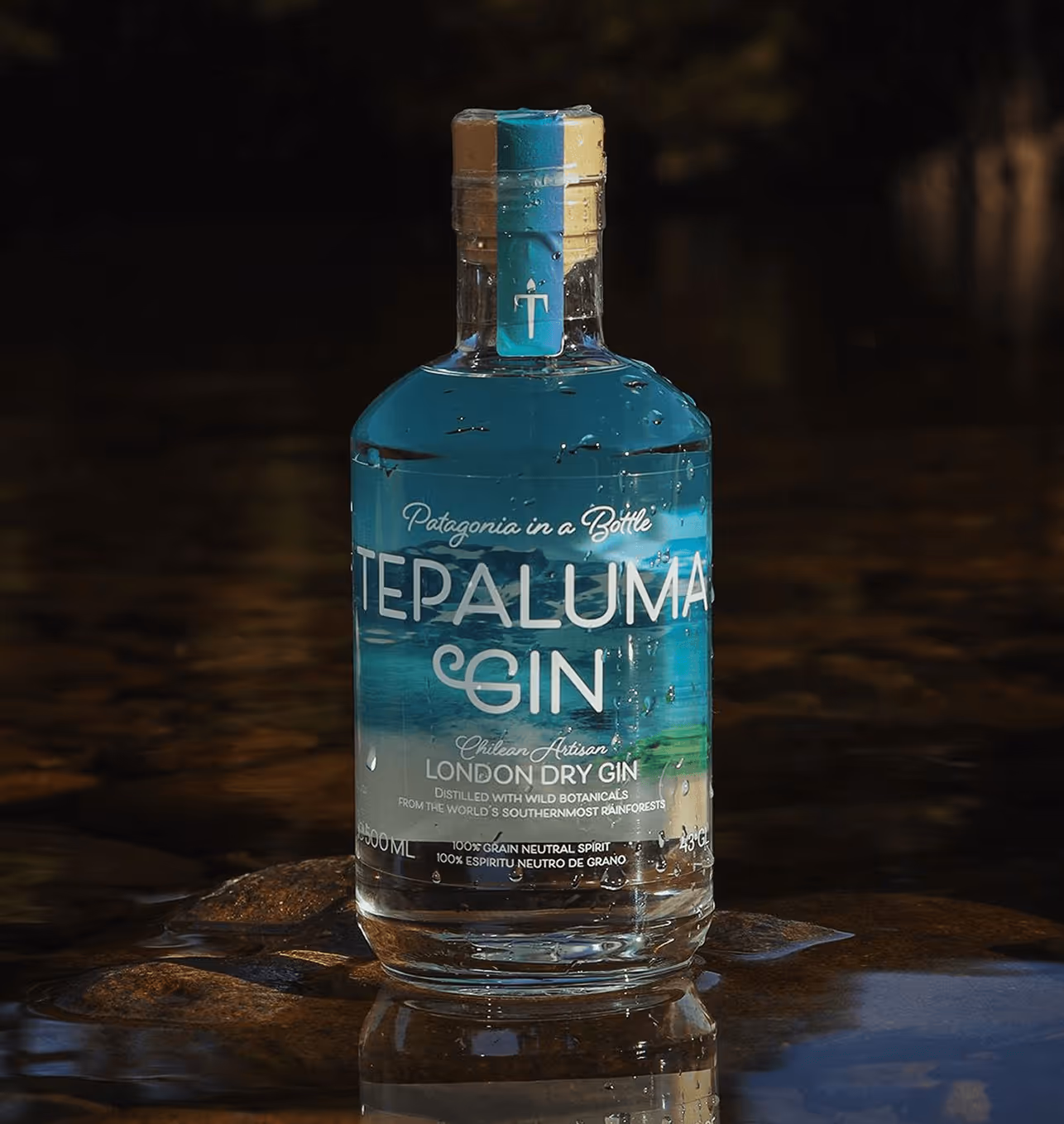 De naam van het merk lag al vast. Daarnaast kregen we carte blanche om een betekenisvol label te ontwerpen. Samen besloten we de ‘T’ van Tepaluma subtiel te stileren naar het silhouet van een condor, een mythische vogel die hoog boven de Chileense bergtoppen zweeft en de ongerepte natuur van de regio symboliseert. Door het etiket transparant te maken, legden we ook de link naar het pure gletsjerwater, de rijke flora en fauna en het ruwe landschap dat de gin zijn unieke karakter geeft. Wat begon als een pioniersverhaal in een land waar wijn regeerde en gin nauwelijks vraag kende, groeide uit tot een internationaal, prijswinnend succes. Door samen een betekenisvolle branding met groeipotentieel te creëren, kon Tepaluma met een vernieuwd label haar naam op de Chileense markt en ver daarbuiten vestigen.